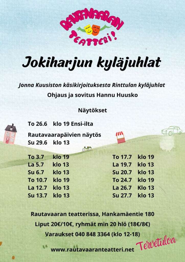 Kesän uuden näytelmän Jokiharjun kyläjuhlat esitysajat ovat selvillä. Kesäistä komediaa näytellään Jokiharjun teatterin uusituissa tiloissa ajalla 26.6. – 27.7.2025 torstaisin klo 19 sekä lauantaina ja sunnuntaina päivänäytöksinä klo 13.